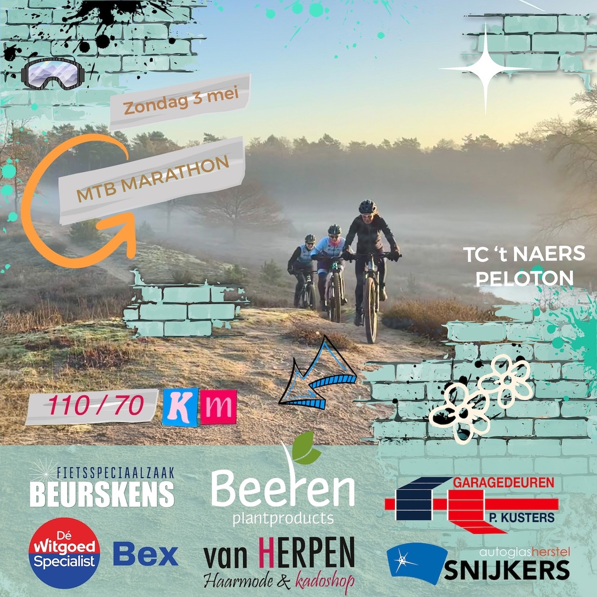 MTB MARATHON 2026 ZONDAG 3 MEIOp zondag 3 mei staat de MTB Marathon weer op de kalender! Kies uit twee routes (±70 km of ±110 km) door afwisselend terrein met singletracks en klimmetjes. We rijden in kleine groepjes op basis van navigatie en halverwege wacht een welkome stop met koffie en vlaai.
