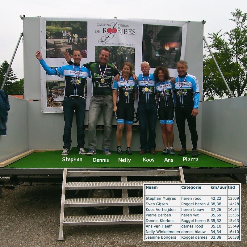 De individuele tijdrit over een afstand van ruim 9 km over Naerse bodem was zeer geslaagd. Onder ideale weersomstandigheden en voor de 1e keer deden ook de wielrenners van wielerclub la Rochelle uit Roggel mee. Een derby was geboren. Fietsfestijn compleet en een heerlijke feestavond bij de Rooëjbes.