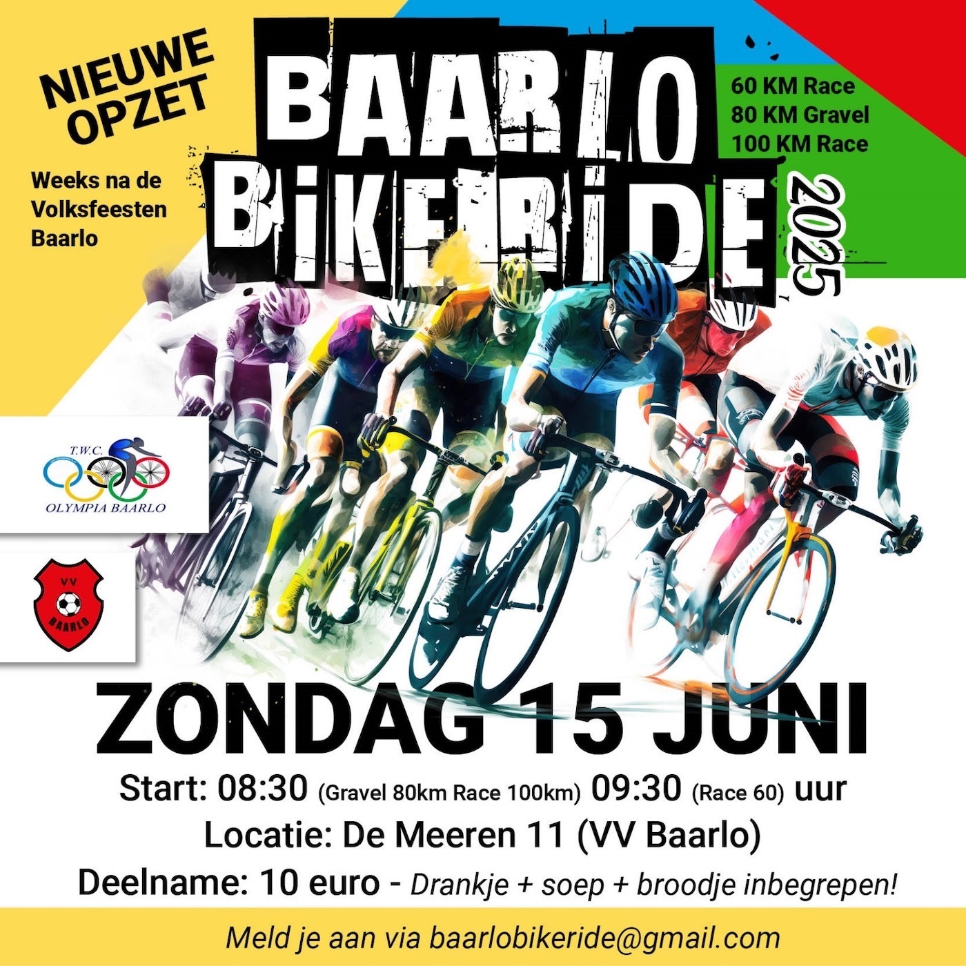 Zondag 15 juni, NIET met de Volksfeesten, is wederom de Baarlo Bike Ride. We gaan een wieler- en graveltoertocht organiseren met TWC Olympia en VV Baarlo. De Baarlo Bike Ride wordt een beetje in een nieuw jasje gestoken. Je kunt kiezen tussen 2 wielerafstanden, namelijk 60 KM of 100 KM.