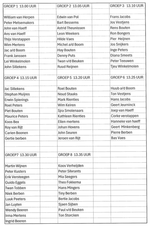 - Jubileum fietstocht: De start van onze jubileum dag zal plaats vinden bij 't Maasveld. Daar vertrekken we, in gemengde groepen, voor een fietsrit van 65 km. Ongeveer halverwege zal er een pitstop zijn, met koffie en gebak. Tijdens de rit is het zaak goed op te letten, aangezien we achteraf vragen stellen, in de vorm van een in te vullen Jubileum Quiz formulier.